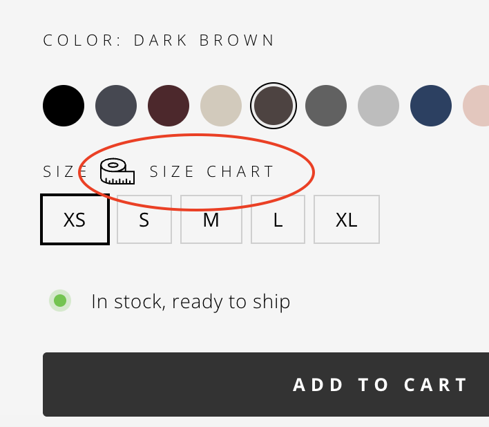 On all our product pages, you’ll find a size guide with measurements. It’s located just below the colour options, as shown in the image below: